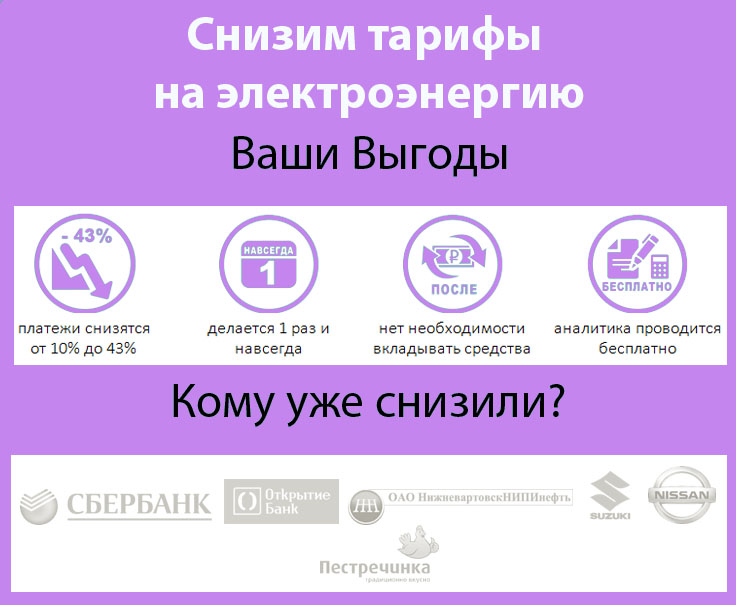 Уважаемые Собственник и Руководитель! Компания РусГрупп является экспертной организацией в сфере снижения цены электроэнергии документальным путём и возврату переплаченных денежных средств. Сотрудники компании являются экспертами секции комитета Государственной Думы РФ по энергетике. Предлагаем провести бесплатную аналитику п… Читать дальшелатежей за электроэнергию всех Ваших объектов. По результатам аналитики мы предоставим информацию на какую величину можно снизить цену электроэнергии и вернуть переплаченные денежные средства. Для проведения аналитики необходимы следующие документы: 1. Акты разграничения границ балансовой принадлежности (по всем объектам); 2. Счета-фактуры (Ведомости потребления) за последние 12 мес.; 3. Договоры энергоснабжения со всеми приложениями и доп.соглашениями. Аналитика бесплатна, производится в течение 7-14 дней, полностью конфиденциальна и защищена договором. По её результатам мы покажем на сколько можно снизить платежи. О РусГрупп: снизили платежи за электроэнергию более 100 компаниям по всей территории РФ; вернули переплаченные денежные средства по арбитражным делам №А20-603/2016, №А20-2409/2016, №А20-2410/2016, №А20-3264/2016, №А07-39537/2017, а также в досудебном порядке. В настоящее время работа по возврату денежных средств реализуется для 3-х регионах РФ; являемся членами экспертной секции комитета Государственной Думы по энергетике. Если есть возможность снизить цену электроэнергии без вложений и вернуть переплаченное, Вы бы ей воспользовались? Прошу рассмотреть предложение.